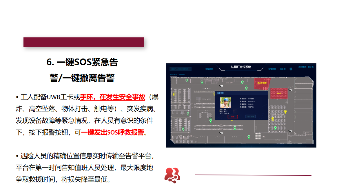 全跡科技UbiTraq冶金鋼鐵高精度定位系統(tǒng),通過在廠區(qū)內(nèi)布設(shè)規(guī)定數(shù)量的UWB定位基站,實時精確地對人員、車輛、資產(chǎn)上的標(biāo)簽進行定位,并將位置信息顯示在廠區(qū)的控制中心,進行安全區(qū)域管控、人員在崗監(jiān)控等,最大限度地避免事故的發(fā)生,助力冶金鋼鐵企業(yè)實現(xiàn)智慧化的安全運營管理。